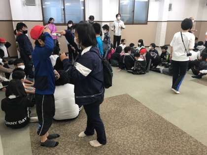 子どもたちは、検温を終え、ストレッチで体をほぐしました。