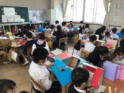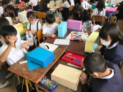 思い思いの箱を持ち寄り、イメージした形になるよう、よく考えながら接着剤でとめている場面でした。