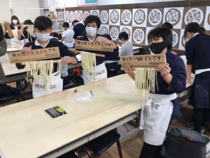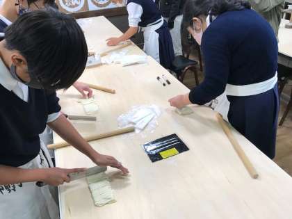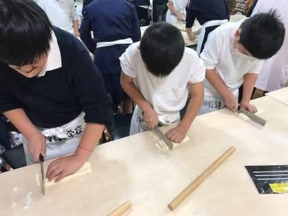 のばした生地を折り畳み、包丁を入れていきます。幅は3ミリメートル。