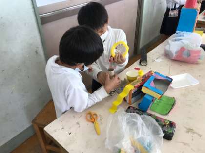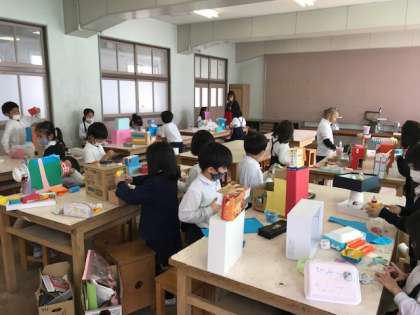 2年生は、ボンドでしっかり固定しながら工作を進めていました。