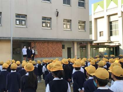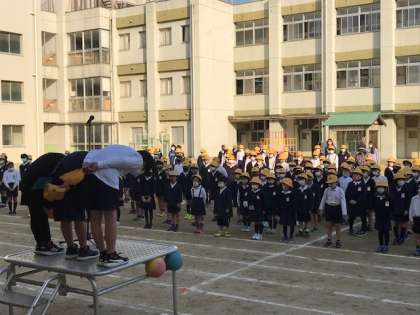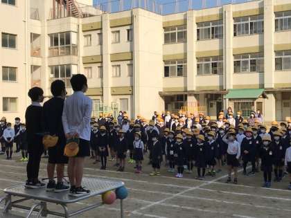 保健委員会の代表が、朝礼台の上から、みんなに呼びかけました。マイクに頼らず、堂々と伝えることができ、とても立派でした。