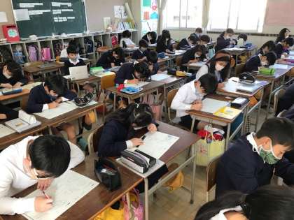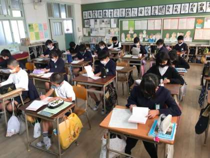 みんなが集中して取り組んでいるため、同じような画像(上から5・4・3年生)に見えますが、今朝も算数の学習をがんばっていました。