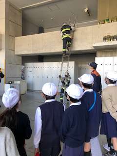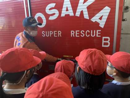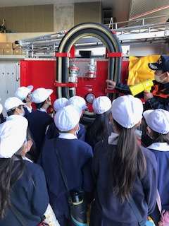 化学車は泡で火事を消すこと、ポンプは20本以上も積んであることなど、消防車のひみつをたくさん教えてもらい、しっかりと聞いていました。