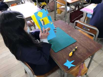 カッターナイフを使って思い思いの窓を作ります。そして、後ろから絵をはり、窓を開けたら「絵」が見えるようにしていきます。