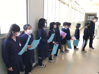 5年生は司会だけでなはく、6年生の教室へ行って在校生がメッセージを作成したメッセージカードを一人一人に手渡す大役を果たしました。