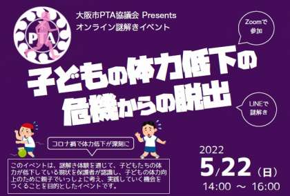 大阪市PTA協議会からオンライン謎解きイベントの案内が届きました。謎解き体験を通じて、子どもたちの体力が低下している現状を保護者が認識し、子どもたちの体力向上のために親子でいっしょに考え、実践していく機会をつくることを目的としたイベントだそうです。