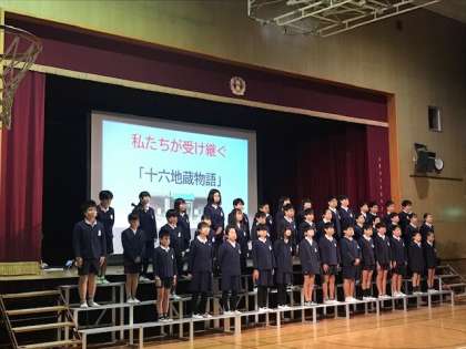 最後の発表は6年生の「わたしたちが受けつぐ『十六地蔵物語』」です。『十六地蔵』にかかわってこられた様々な人々の思いを受け継ぐ、堂々としたみごとな発表でした。最後には、平和への思いのこもった素敵なハーモニーをきかせてくれました。