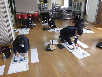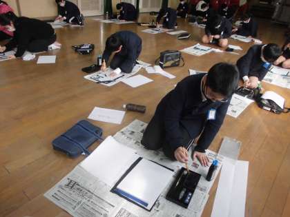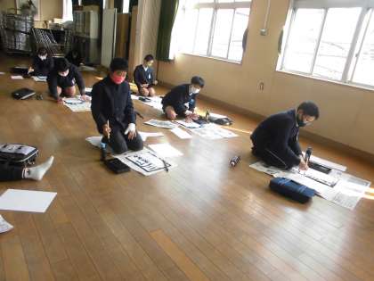 今年の目標を毛筆で書きました。普段は机と椅子ですが、今日は床の上に正座をしながら書きました。少し書きにくかったかもしれませんが、みんな集中して取り組んでいました。