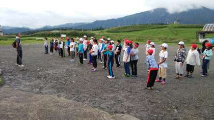 「やまとよ」前の高原で、体操して体を目覚めさせます。