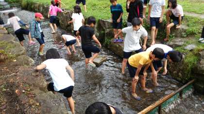 このところの雨で、水量が増していますが、児童は元気に川に入ります。