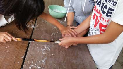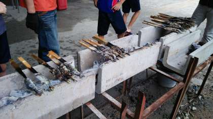 その後、捕まえた魚に自分で串を刺して塩を振って、スタッフの方に焼いてもらいます。