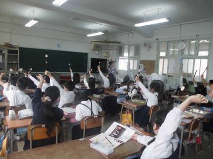 ますは、リコーダーを持ったまま「自由の女神ポーズ」で左手を挙げ、そのまま胸の前にもってきます。そして「トゥー」と優しく吹きます。何度も練習していくと、だんだん揃ってきました。いろいろな音を覚えて、たくさんの曲が吹けるようにしていこうね。