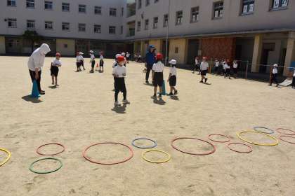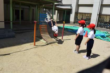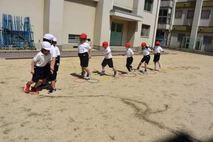 鉄棒、ボール投げ、ジャングルジム、ケンパ、赤白に分かれてグルグルじゃんけんなど、運動場の全面を使って、たくさん体を動かしました。