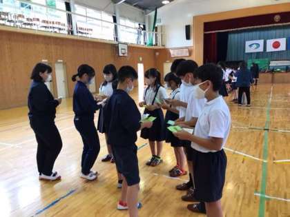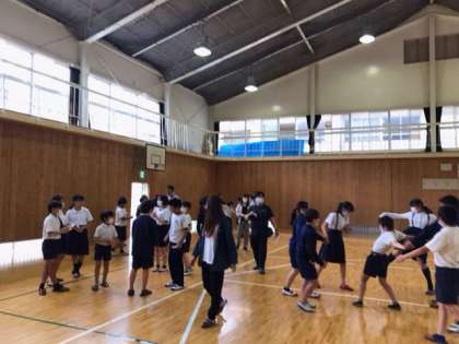 貞光小学校の6年生との交流活動です。最初はお互いにやや緊張していましたが、すぐに打ち解け、どの班も楽しく交流しています。