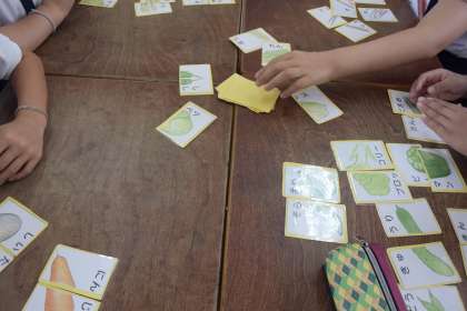 まずは、野菜カードの絵合わせをしました。わいわいと楽しそうですが、真剣勝負です。