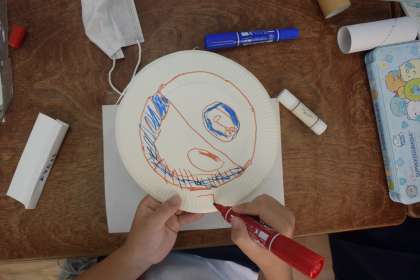 紙皿をタイヤに見立てて、ころころ転がるおもちゃを作りました。