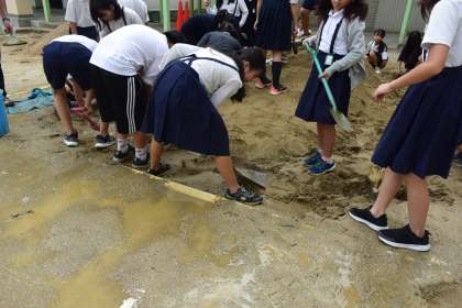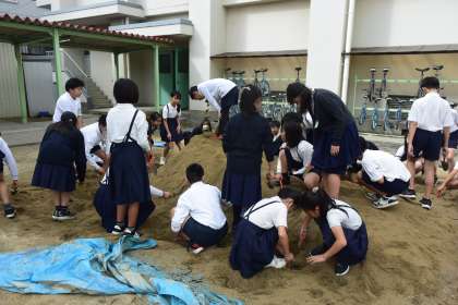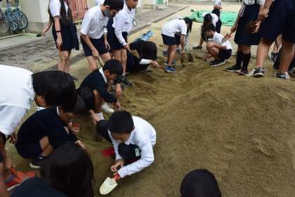 今日はまず、みんなで砂山作りをして準備しました。
