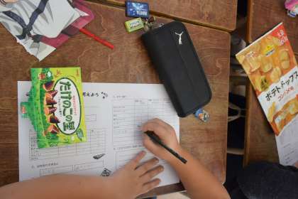 自宅から持ってきたお菓子箱の表示を見て、食べる量を考えました。
