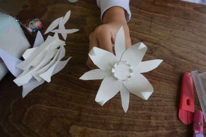 画用紙で立体の花を作りました。今日は練習でしたが、細部までこだわっていて、とても上手でした。一度作ってみると、次はこうしてみようというのが出てきて、もっと良い作品になりますね。できあがりが楽しみです!