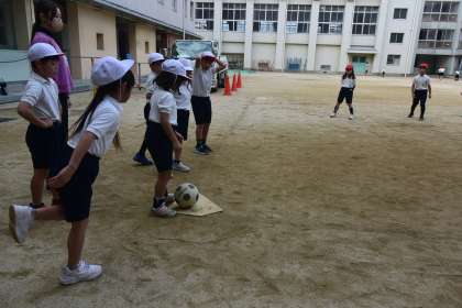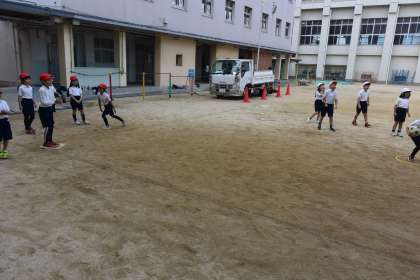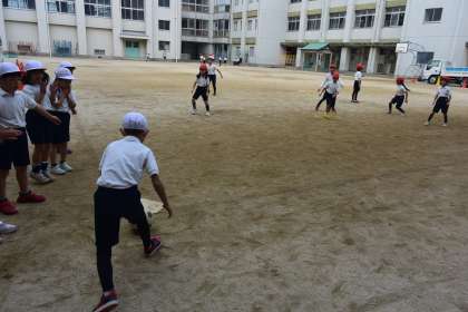 守る側は、内野に置いたフープの中に飛んできたボールを持っていければアウトがとれます。