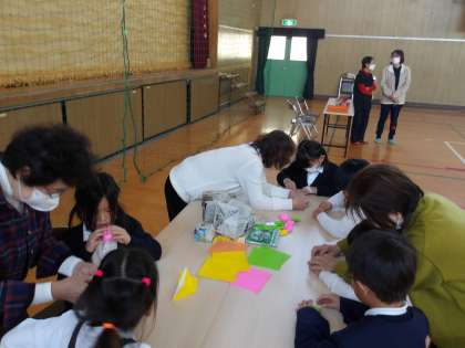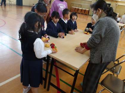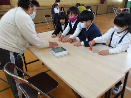 講堂で「昔あそび」をしました。地域の方々に来ていただき、たくさん教えていただきました。
