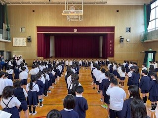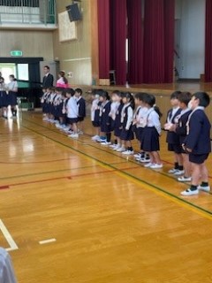 1年生を迎える会がありました。初々しい様子の1年生を、みんなで校歌を歌って歓迎しました。2年生からは、お祝いにメダルをプレゼントしました。1年生のみなさん、これからよろしくお願いします。