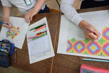 色のついていない八角形の模様に好きな色を塗って、絵を描きました。
