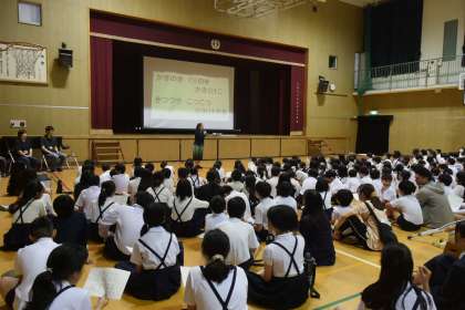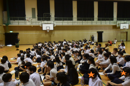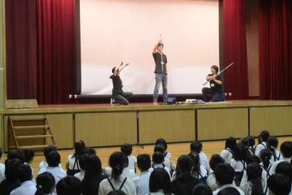 作品「一休さん」の説明や鑑賞のコツなどについて聞いた後、演劇の発声・発音の練習や呼吸法を教えていただきました。