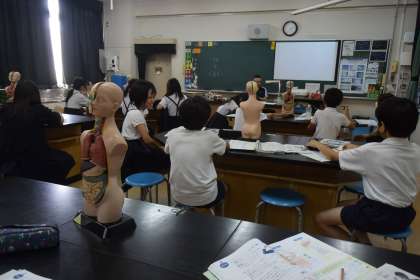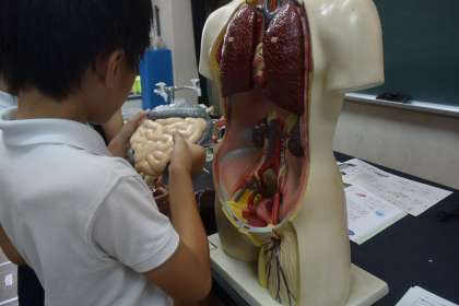 人体模型をつかって、心臓や肺、消化器官などの場所や役割について調べました。