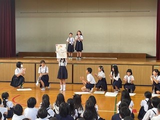 今日の児童朝会で、100周年のマスコットキャラクターが決定したことが行事運営委員会から発表されました。いくつかの案の中から、投票の結果「みなみちゃん」に決定しました。みなみちゃんが、南恩加島小学校100周年をより盛り上げてくれることを期待しています。