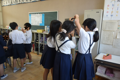 1,2組合同で、学習発表会の衣装や小道具を作りました。