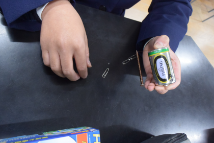 導入として、コイルを乾電池につないで、クリップが付くかどうか調べました。