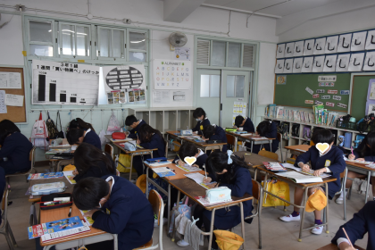 手紙や新しいドリル類などを配った後、新しい漢字の学習をしました。