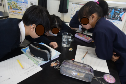 また、ものの溶け方の実験をして、食塩が水に溶ける様子を観察しました。