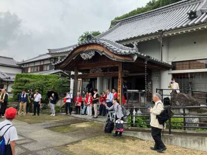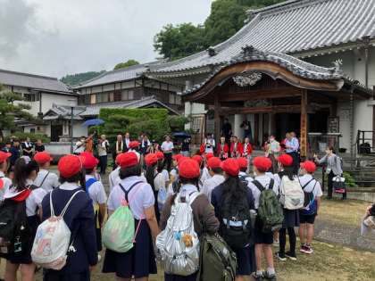 貞光小学校で平和の鐘を鳴らした後、十六地蔵尊が立つ真光寺に移動して、地域の方々や貞光小学校の6年生と交流しました。