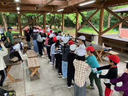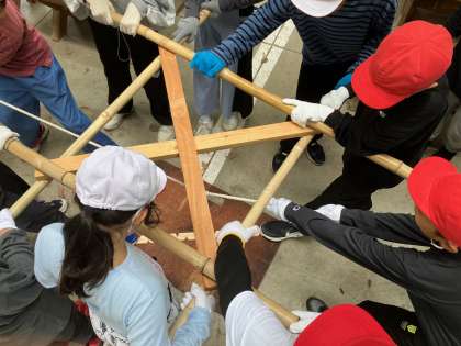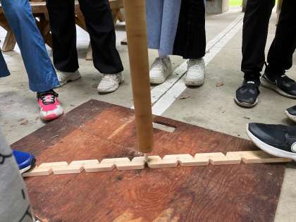 説明を聞いた後、実際に火起こしを体験しています。マッチやライターを使わず火が起きたことに、驚きと感動が沸き起こりました。