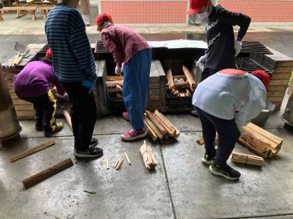 火おこしの担当、調理の担当、それぞれ協力しながら進めています。