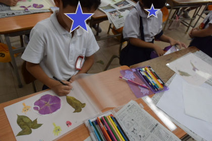 育てていたアサガオが大きく育ち、花もたくさん咲きました。