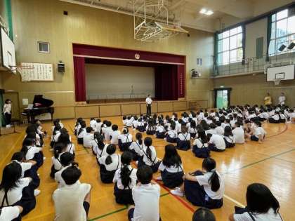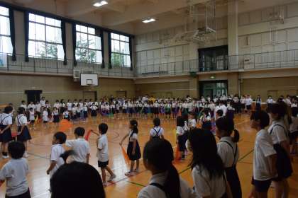 明日から、夏休み。5時間目には、全校集会がありました。校長先生、生活指導の先生の話があったあとは、今年も音楽の時間がありました。全校児童でまるくなり、顔を見合いながら「365日の紙飛行機」を歌いました。綺麗な歌声が響く、素敵な時間になりました。