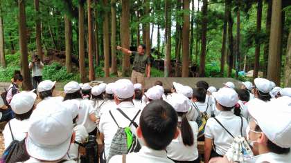 森の中のステージで木の説明を聞き、学習しています。