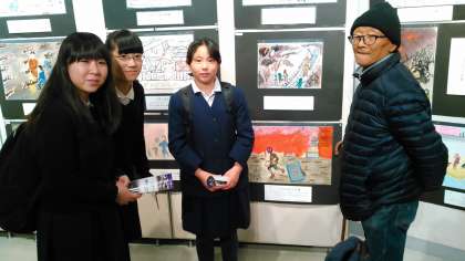ピース大阪で展示されているものについて話をしているところで出逢いました。みんなと話しているところに静かにうなずきながら聞いている岩田さん。