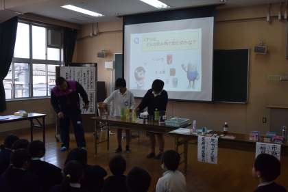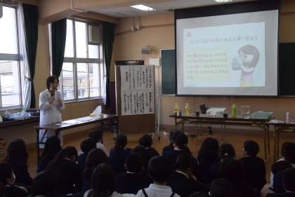 学校薬剤師の金城先生に来ていただいて、薬の正しい使いかたについて学習しました。お茶やジュースなどで薬を飲むと効果がないことを実験を通して理解することができました。水や白湯が一番いいようですね。