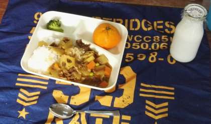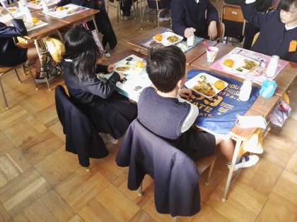 今日の給食はふゆやさいのカレーライスでした。だいこんやれんこんなど野菜がたくさん入ったカレーライスでした。とてもいいにおいで、子どもたちも美味しくいただきました。みかんも甘く大人気でした。