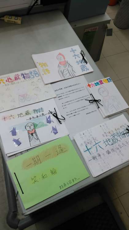 6年生は6年間の学習のまとめとして、映画『十六地蔵物語』と本『十六地蔵物語』を絵本にまとめました。お話のまとめには今年の交流会でしたことや感じたことをメッセージとして書きました。
