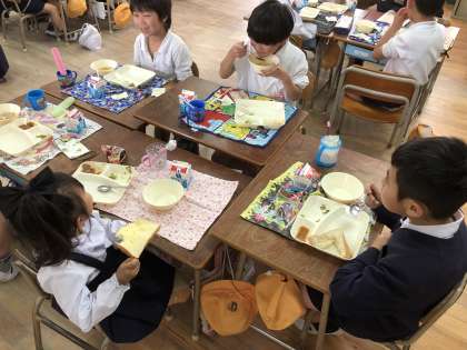 お肉はトマトベースの味付けがしてあり、ボリュームたっぷりです。食パンにはバターがついていました。みんな、たくさん食べていました。