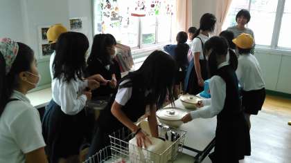 この日は4年生は休み時間ごとに理科の『気温調べ』をしています。それと両立しながら1年生の給食を運びました。