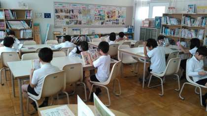 今年度初めての図書の学習に行きました。自分の読みたい本を選び、座って、しーんとした空気の中でたくさんのお話に出逢いました。
