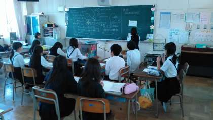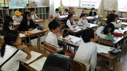 4年生から6年生までの学級代表が集まり、今年の学校のスローガンを決めました。