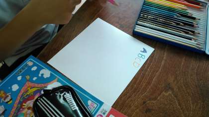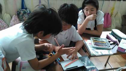 アルファベットから感じる色で作品をつくっていきます。そんな中、早く終わった人が友だちを手伝います。