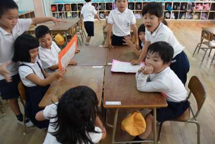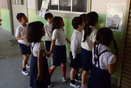 手をつないで仲良く学校探検。